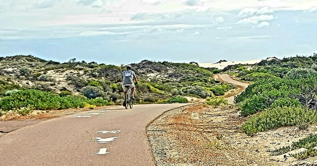 Biking the 12 kilometre Turquoise Trail . Sandhills, beaches and saltbush