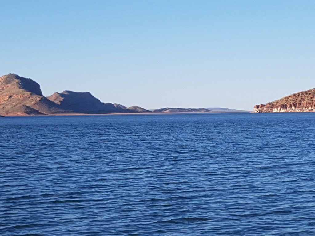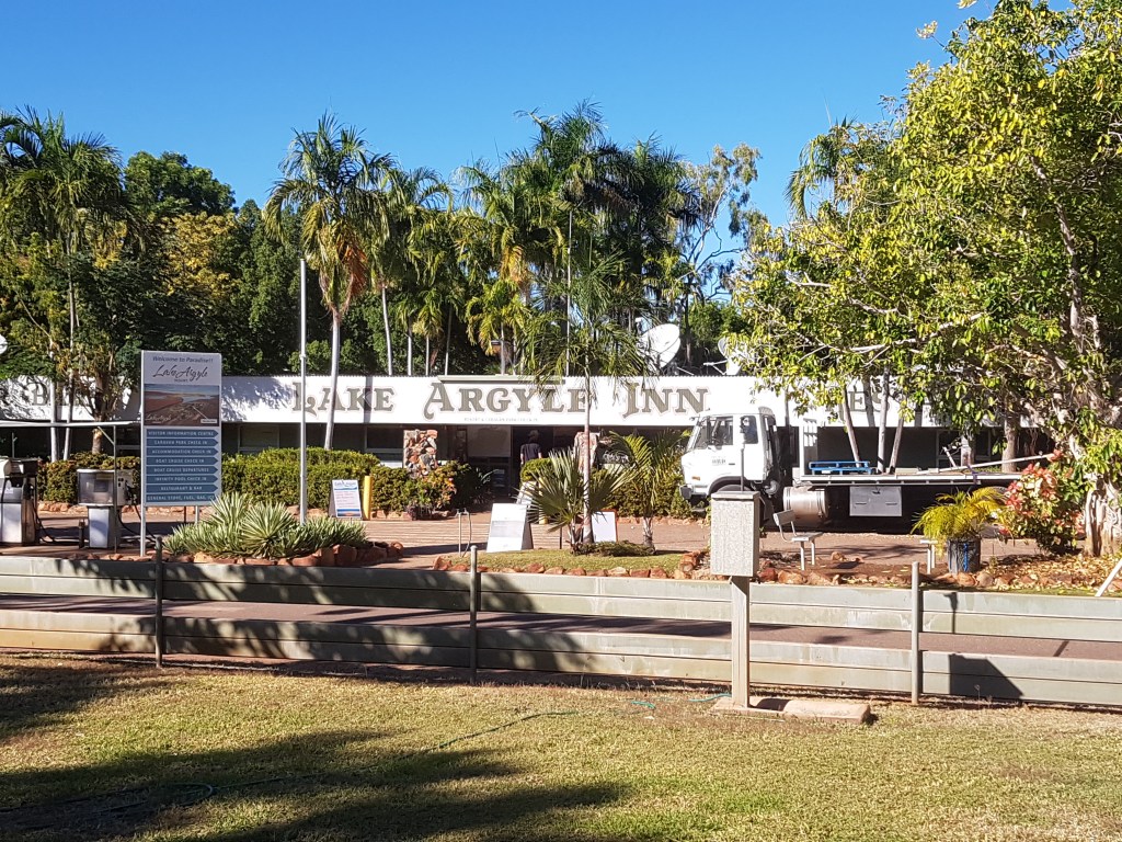 Lake Argyle Campground or Resort as it likes to call itself sprang from the old damsite workers accommodation. It is a lovely spot overlooking the lake, nicely grassed and shaded. It would be in our top 10. And it has a spectacular infinity pool on the camp edge overlooking the lake with very few people swimming. Has to be perfect. Except it is quickly apparent why there are no swimmers. It’s bloody freezing. The night temperature gets down to 15C or below and the uncovered and unheated pool never gets a chance to warm up even though the winter days get to 30C. Great for a wake up though. I asked one of the staff when the pool got warm. “Gets like a bath in summer. Unpleasant. And freezing in winter. Maybe it is ok briefly in April. I never swim” she said. Nevertheless we enjoyed it. And that view. Wow. We had a very pleasant sunset tour and a swim in the lake (apparantly there are 20,000 freshwater crocs in the lake) then, sadly, after three days there we left Western Australia. It had been our home since March and we had enjoyed every minute of it including meeting some beautiful people on the way who will remain friends. But Northern Territory here we come.