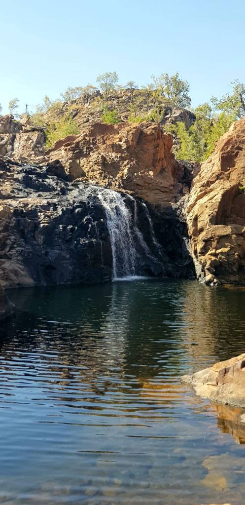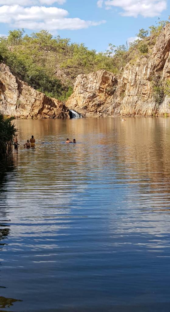 We started the 320kms trip to Darwin from Katherine but got only 40 kms up the road before taking a right turn off the highway towards Edith Falls. People in the campground had talked about this scenic part of the Nitmiluk National Park so we made a last minute decision to spend a day there. It was worth it. Edith Falls is on the Edith River and is part of a series of four pools and waterfalls. We hiked the trails up and around the top pools and swam in crystal clear water which is crocodile free. The rangers constantly monitor the area and set crocodile traps to ensure safe swimming. The national park campground is very well looked after with large grassy spots under shady gum trees and there is even a cafe and small store for campers and the good number of daytrippers who visit.