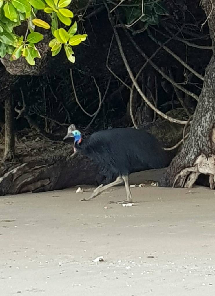 We had booked there because we were told that the cassowaries were in rare existence. In fact so much so that they came around in the morning for breakfast. That is from anyone who was foolish enough to leave food about. The couple beside us scrambled to put their food away as two of these magnificient birds strolled up and scoffed the orange and bananas left on the table. They really are a sight these birds. With their blue neck and head plumage, red wattles and hard topknot they are quite imposing. Found in only PNG, Indonesia and northern eastern Queensland they can stand up to 2m tall and get to 60kgs – smaller only than the emu and ostrich. Whilst shy in nature they are labelled the world’s most dangerous bird because of the kick they can deliver with their large three toed feet and dagger like claws. And don’t think you can poke fun and run away. Small winged and flightless they may be but they can also run at up to 50kms per hour. Luckliy the camp duo were friendly enough as they knew they would get fed. Quite an encounter. We tried to book another night but no chance.