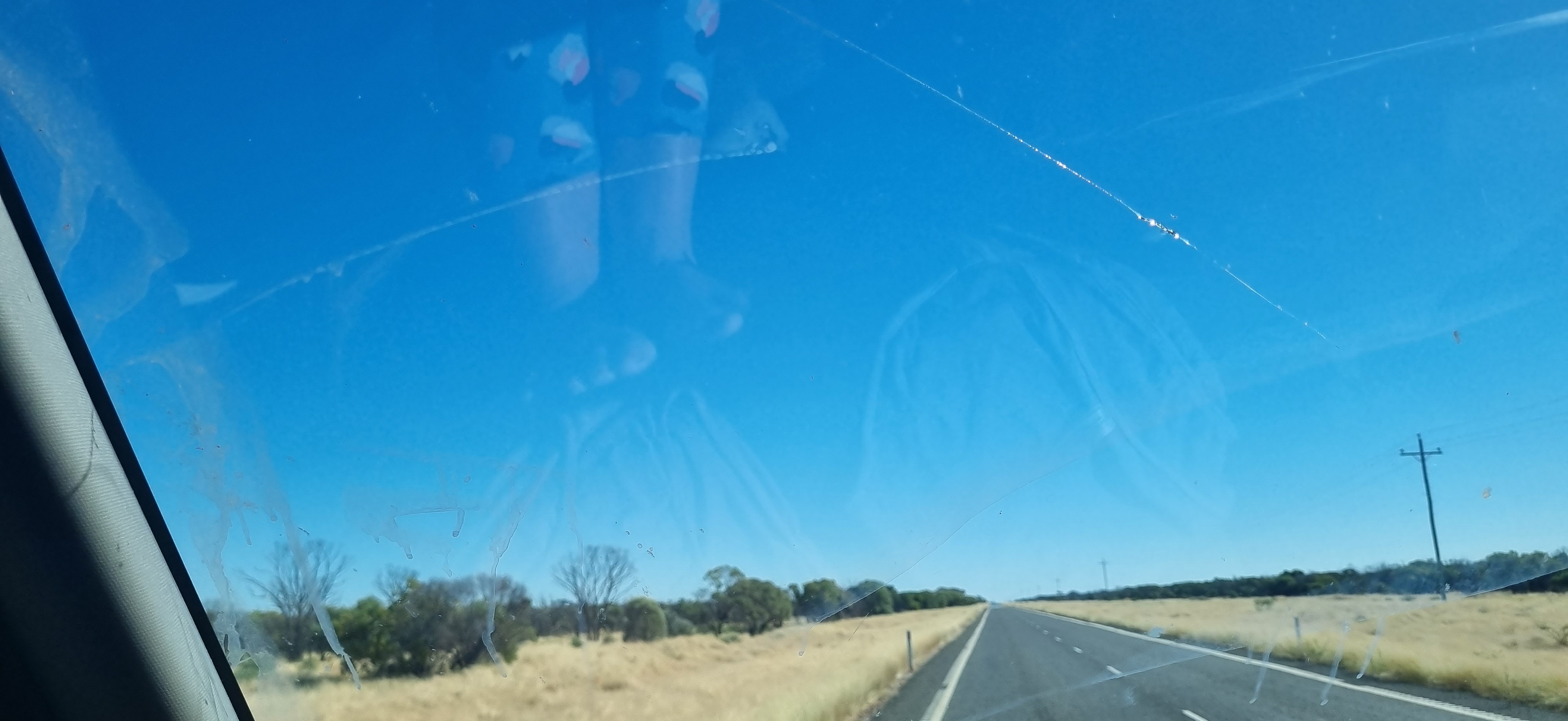 Back to the Labour Government. After saying they wouldn’t during the election campaign in 2022 the ALP Govt. is planning to take the axe to dividend imputation and other super annuitant tax relief. Oh woe is us! Our spirits were lifted though when we reached our next stop at Kyuna or more precisely the Blue Heeler Pub and Jolly Swagvan (get it?) campground. We had stopped for a brief visit at Longreach to consult an Auto Glass repair expert. Not two days into our journey along with the insects and moths that constantly bombard the windscreen a sizable pebble whacked the passenger side followed by a widening near 50cm crack across the passenger’s vision. The highways are good but only two lane so the road trains and locals speeding to town throw up a mixture of rocks and other debris. It is a lucky traveler who doesn’t have at least two or three stone chips in their windscreen. The autoglass expert (as opposed to Scout) explained the makeup of a windscreen, advised us not to worry and fix the whole thing when we got home.
