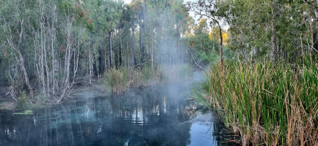 We had one night at Banka Banka West Station, a popular campground set up on the Banka Banka cattle station that is situated an hour up the Stuart Highway from the Three Ways turn off some 960 kms south of Darwin. Then a night at Bitter Springs just outside the small town of Mataranka. The area is so named because of the natural thermal pools in the Roper River which flows through the Elsay National Park in the Katherine Region. The campsites are set under large gum and melaleuca trees. Such a restful evening after a hot soak in the springs. Mataranka is some 420kms south of Darwin. We had four days to kill before we were due in Darwin and the start of the “big cricket event” and we decide to spend them in Litchfield National Park. Such a good choice and deserving of a post on its own.