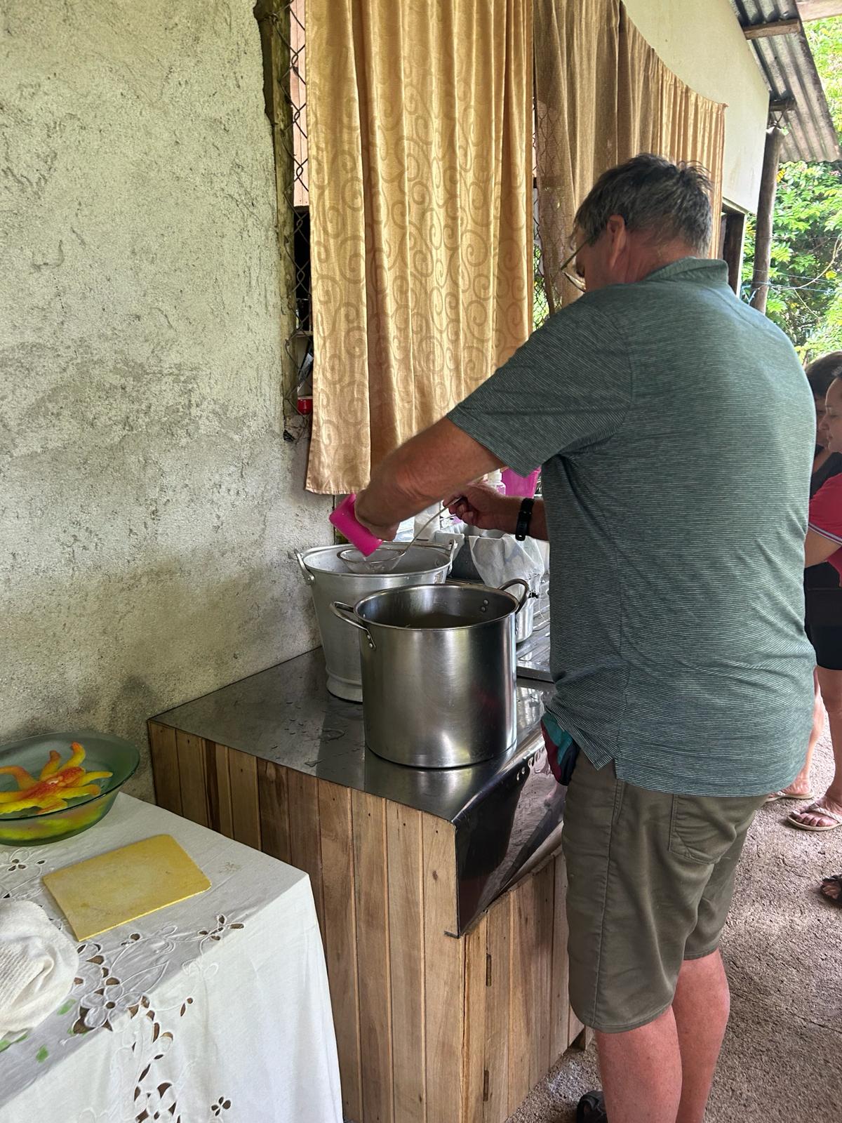 About five years back an enterprising community leader floated the idea of promoting tourism in the community to supplement the income from cattle raising, milk production and cropping – cassava, coffee, plantain and pineapple. The families that have embraced this new enterprise offer a farm stay, farm tours, rain forest walks and a look into the artisanal production of coffee, chocolate and cheese making. Scout and I stayed in the home of Don Carlos and his about to have a baby in two weeks wife, Elevette. A lovely couple with no English we struggled a little to communicate but with the judicious use of Google Translate (thanks modern technology) we got some of their backstory. The nearby houses, also homestays, for our group included Don Carlos’s sister and sister-in-law. This could be described as a matriarchal society as the absence of men (either gone or working away) was apparent and the women seemed well in charge. We enjoyed a two hour forest walk and a substantial evening meal of, you guessed it rice and beans supplemented by some delicious chicken stew, roasted plantain and fried cassava and cheese balls. The thing here was for our group to muck in and assist with food preparation including grating cassava, rolling out tacos and preparing vegetables – the grunt work in other words. But we enjoyed the meal and conviviality. Josh, Sidra and I also rose early the next morning and were found at 6.30 am at Carlas milking cows and making cheese. Sort of. Really we pulled a few cow boobs and stirred and drained the resultant curds and whey. More importantly we enjoyed a delicious breakfast of eggs, fried cheese, roasted plantain and a warm and delicious concoction of milk, ground maize and banana along with a cup of strong Costa Rican coffee.